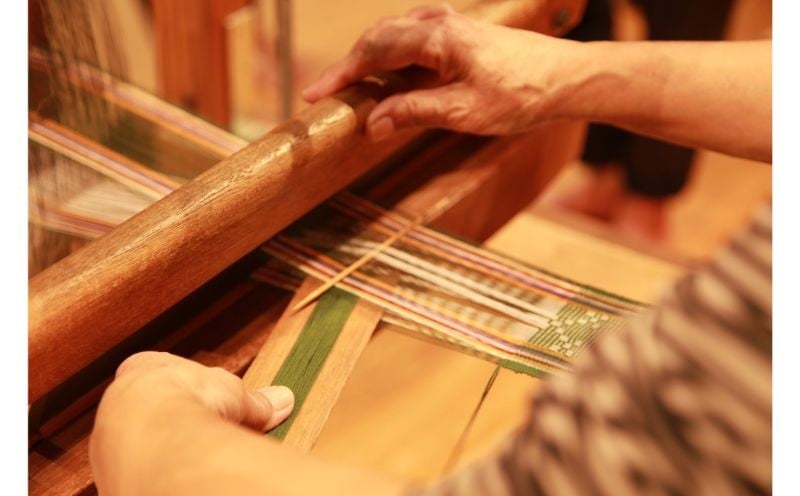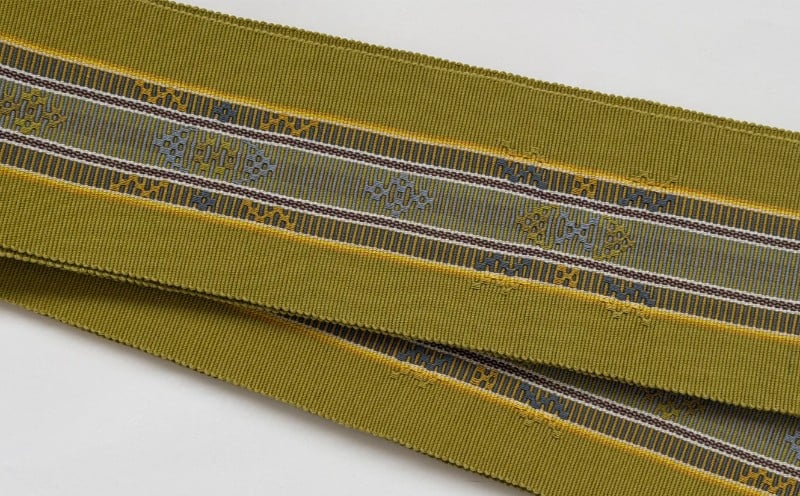 伝統工芸【読谷山ミンサー】細幅帯<抹茶・1点もの> ☆ 帯 着物 沖縄 織物 読谷村 普段使いに 花織 1点物