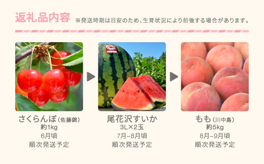 - 【先行予約】フルーツ 定期便 さくらんぼ 佐藤錦 すいか もも 桃 川中島 全3回 果物 フルーツ 2026年産 山形県産 ja-ft3xx