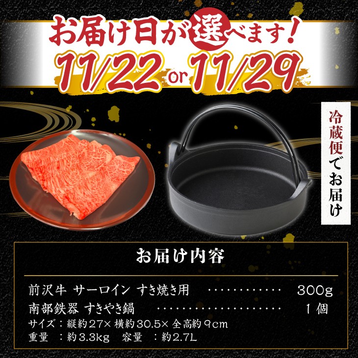 【ふるさとチョイス大感謝祭イベント限定】前沢牛 サーロイン すき焼き 300gと 南部鉄器 すき焼き鍋 二刀流セット 数量限定 期間限定 【冷蔵発送】【11月22日または11月29日お届け】 離島配送不可 [U0230-1] [U0230-2]