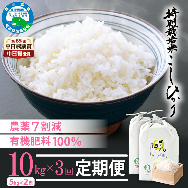 【ふるさと納税】 令和7年産 米 定期便 ≪3ヶ月連続お届け≫ 特別栽培米 コシヒカリ 10kg × 3回 福井県産米(有機肥料100% 農薬7割減)「そよ風田んぼ」【人気品種 こしひかり 計30キロ】 [e10-h003]