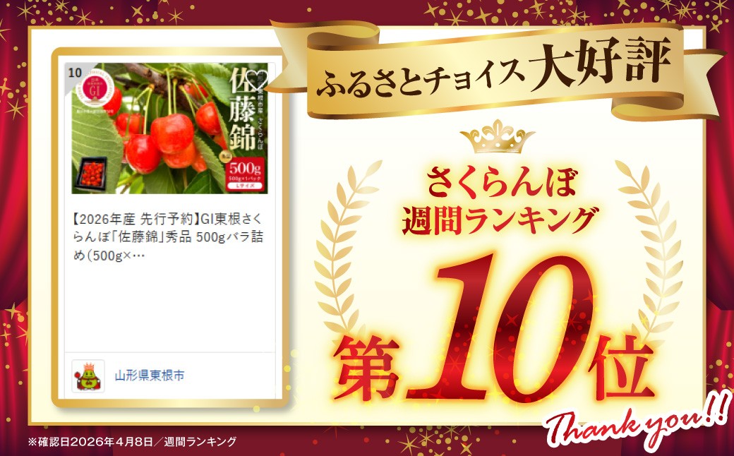 - 【2026年産 先行予約】GI東根さくらんぼ「佐藤錦」秀品 500gバラ詰め(500g×1パック) Lサイズ 山形県 東根市 hi088-010