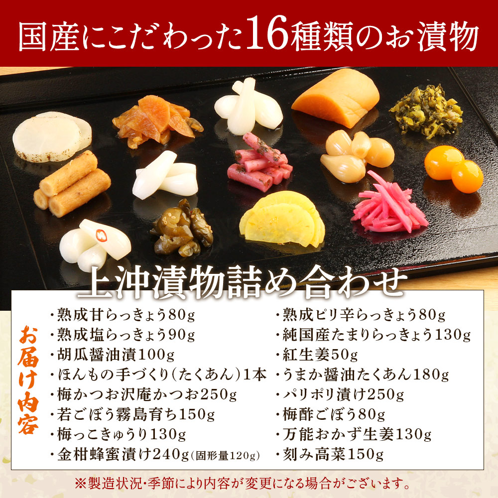 <上沖漬物詰め合わせ(16品)>国産野菜 つけもの ご飯 朝ごはんのお供 おつまみ 和食 付け合わせ 熟成らっきょう 梅酢 きゅうり 醤油漬け ごぼう 金柑蜂蜜漬け 大根 梅かつお たくあん万能おかず生姜 刻み高菜 パリポリ【A-0301-ko】【株式会社 上沖産業】