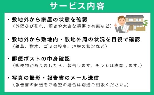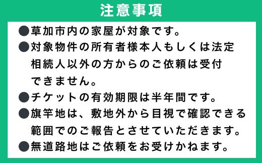 - 【埼玉県草加市内限定】実家・空家の見守りサービス(1回分)| セキュリティ 空き家 安心 サービス 見守り 見回り 実家 家 家屋 管理 長期不在 防犯 物件維持 美観向上 トラブル回避 災害リスク 不審者侵入 不法投棄 地域の安全 埼玉県 草加市