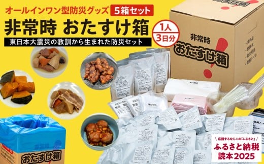 - 防災グッズ 非常時 おたすけ箱(1人3日分)×5箱 防災 防災セット トイレ 水 備蓄 非常用 簡易 非常食 飲料水 簡易トイレ 防災食 非常時持ち出し 避難グッズ 5人用 5年保存 長期保存 災害 石巻 宮城県 石巻市 送料無料 防災減災