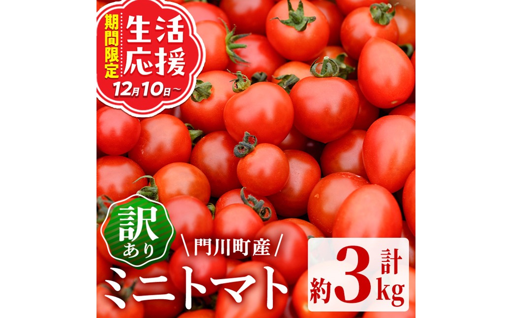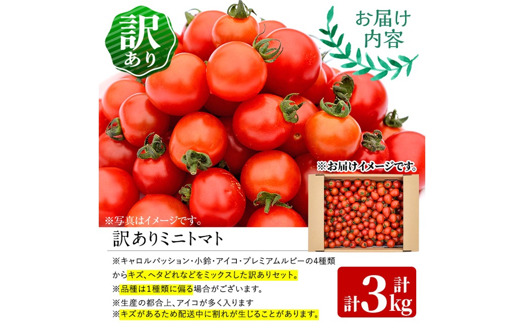 - 訳あり 規格外 数量限定 門川町産 ミニトマト(計3kg) 訳あり 規格外 数量限定 門川町産 ミニトマト 期間限定 生活応援 とまと 野菜 ミックス 生 旬野菜 冷蔵 小鈴 キャロルパッション プレミアムルビー アイコ 【いけとも農園】【X-10】