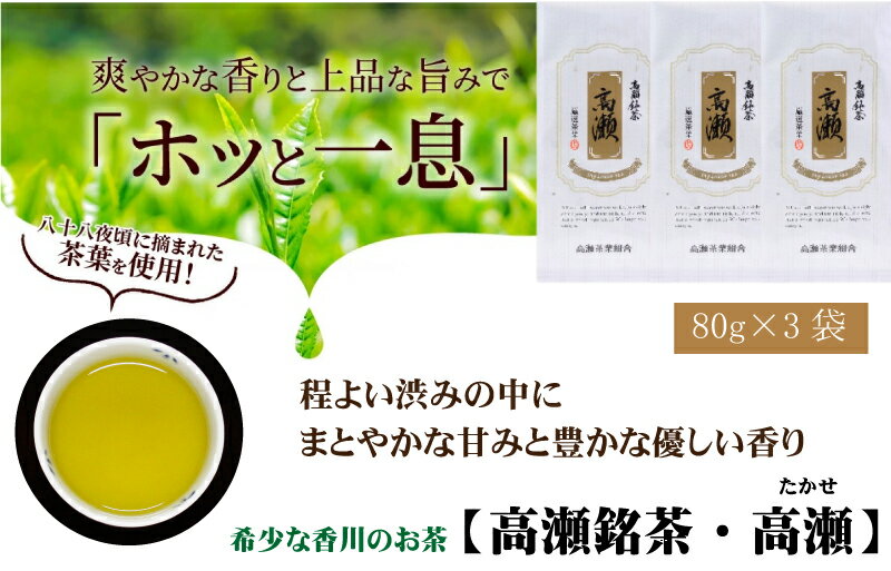 - 【ふるさと納税】 香川県 三豊市産 希少茶 高瀬銘茶・高瀬(たかせ) 煎茶 80g 選べる 1袋 3袋 [ 日本茶 緑茶 高級煎茶 茶葉 国産茶 健康茶 香り 美味しい 人気 お取り寄せ グルメ ギフト 贈答用 プレゼント 手土産 送料無料 返礼品 特産品 ギフト館ふじむら ]