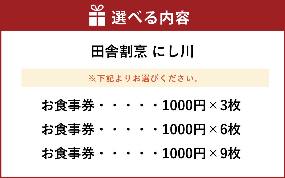 - 【ふるさと納税】田舎割烹 にし川 お食事券 <選べる金額> 1枚1000円 3000円分(3枚) / 6000円分(6枚) / 9000円分(9枚) 田舎料理 割烹料理 山菜 茸 おばんざい 芋煮 串焼き 銘肉 銘魚 和牛すき焼き 惣菜 ごはん ご飯 商品券 ギフト券 チケット 牛肉 お肉 野菜 送料無料