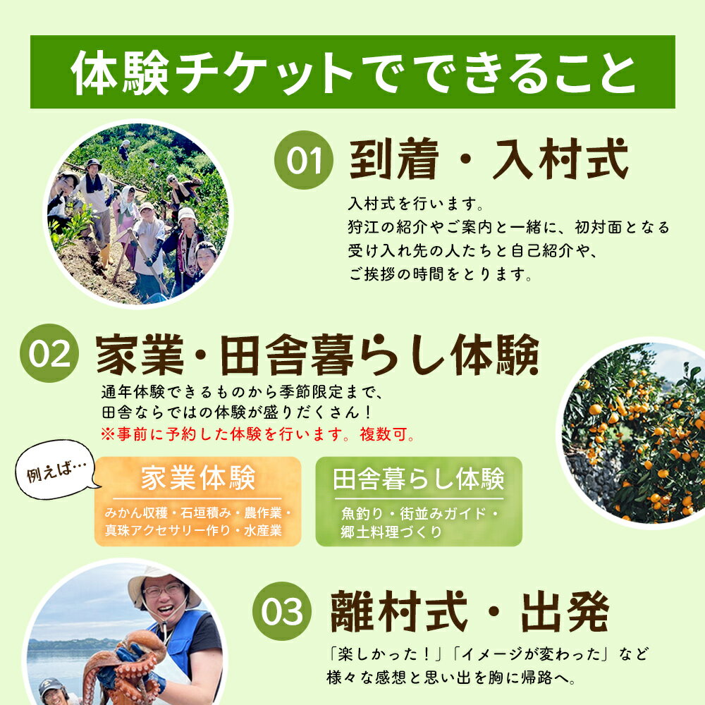 - 【ふるさと納税】<狩江地区田舎暮らし体験チケット(3,000/5,000/10,000円)> 田舎 体験 自然 旅 旅行 トラベル 観光 レジャー アウトドア アクティビティ Eバイク 家業体験 収穫 漁業 農業 料理体験 郷土料理 特産品 かりエンジョイ 愛媛県 西予市『4月以降に発送開始』