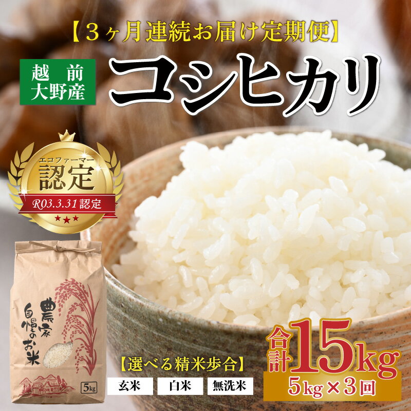 - 【ふるさと納税】【令和7年産】【3ヶ月定期便】越前大野産 エコファーマー認定農家栽培 コシヒカリ 5kg × 3回 計15kg お米・こしひかり・金賞 [C-001006]