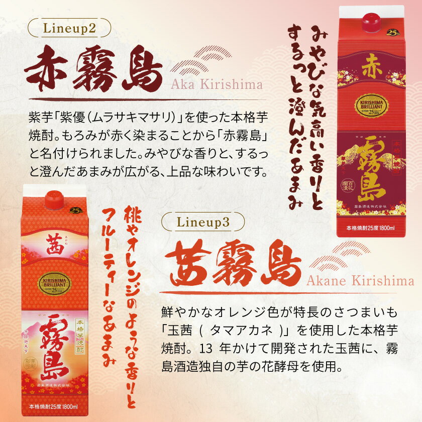 - 【ふるさと納税】霧島酒造「赤・茜・黒」パック(25度)1.8L×6本 - 本格芋焼酎 1.8リットルパック焼酎 赤霧島 黒霧島 茜霧島 3種 酒 飲み比べ 定番焼酎 いも焼酎 送料無料 33-19-008【宮崎県都城市は2年連続ふるさと納税日本一!】