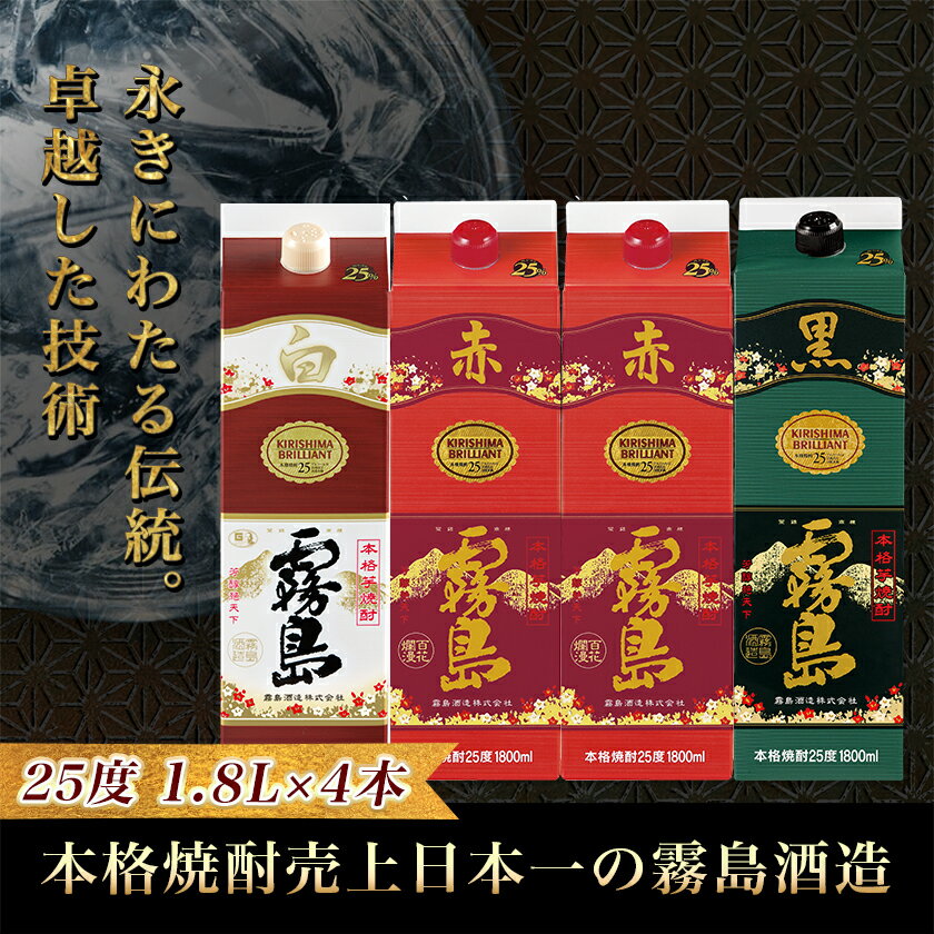 【ふるさと納税】霧島酒造「赤・黒・白」25度パック1.8L×4本 - 本格芋焼酎 黒霧島25度/白霧島25度各1.8L×1本 赤霧島25度1.8L×2本 パック 計4本セット お酒 飲み比べ 焼酎ハイボール ロック 送料無料 22-19-002【宮崎県都城市は2年連続ふるさと納税日本一!】