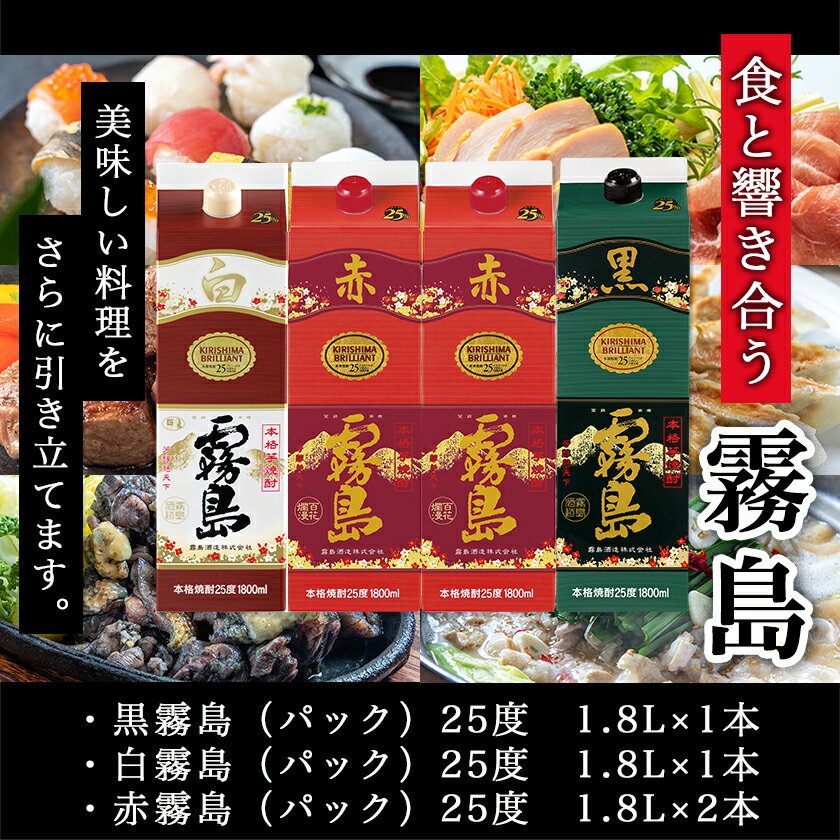 - 【ふるさと納税】霧島酒造「赤・黒・白」25度パック1.8L×4本 - 本格芋焼酎 黒霧島25度/白霧島25度各1.8L×1本 赤霧島25度1.8L×2本 パック 計4本セット お酒 飲み比べ 焼酎ハイボール ロック 送料無料 22-19-002【宮崎県都城市は2年連続ふるさと納税日本一!】