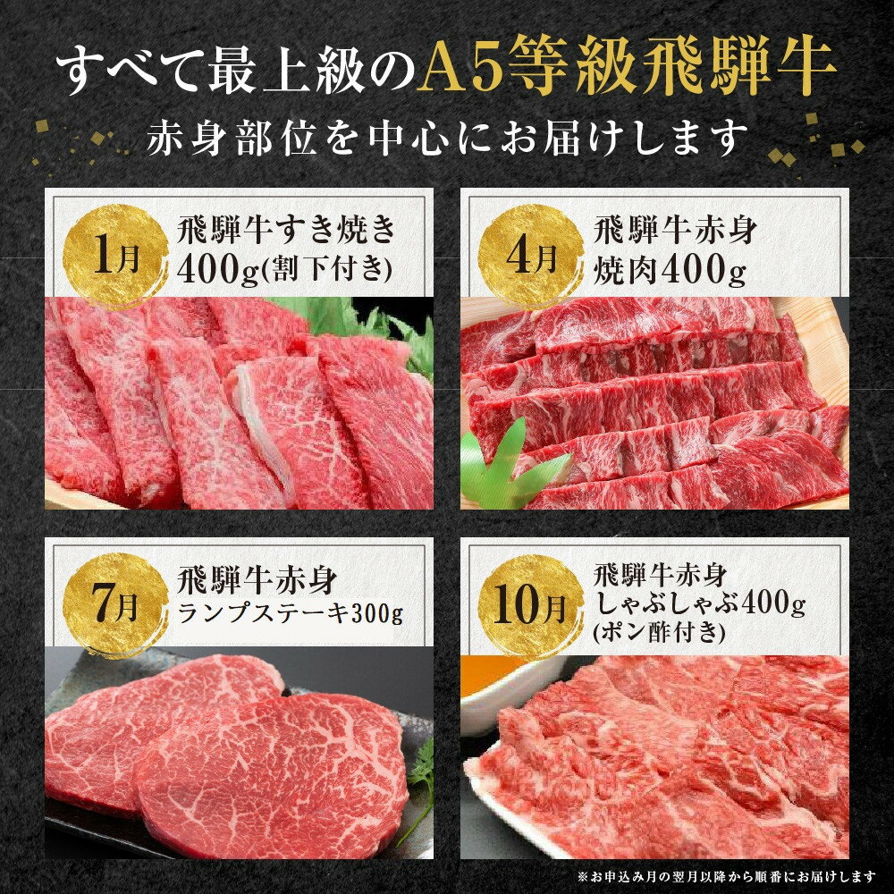 【ふるさと納税】A5等級飛騨牛 定期便 4回(すき焼き/焼肉/ステーキ/しゃぶしゃぶ)【1月・4月・7月・10月発送】| 冷蔵配送 定期便 飛騨牛 赤身 年4回お届け おいしい 人気 飛騨高山 岩ト屋 HF110