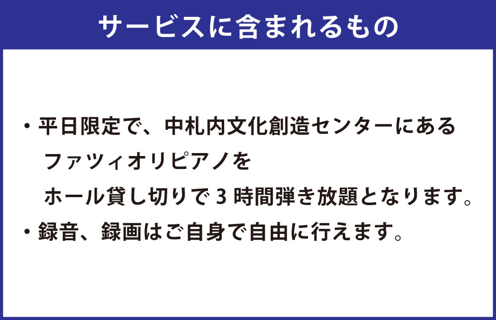 - 【ふるさと納税】グランドピアノ「FAZIOLI(ファツィオリ)」 平日3時間弾き放題 1回分 ピアノ演奏 体験 チケット ファツィオリピアノ 貸切ホール 中札内文化創造センター 音楽 楽器 演奏 施設利用券 北海道 中札内村 送料無料 [046-0258]