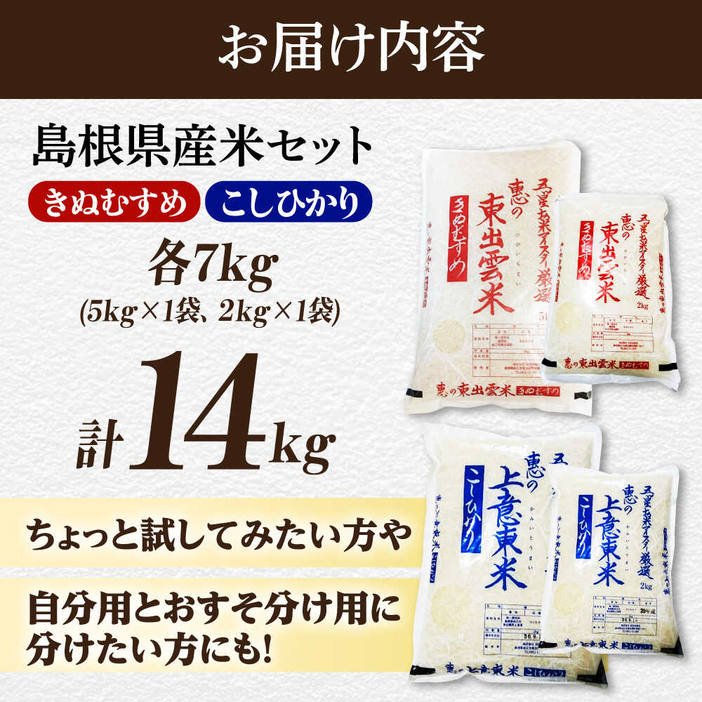 - 【ふるさと納税】米 五ツ星お米マイスター厳選 こだわり米食べ比べ (上意東産コシヒカリ・東出雲産きぬむすめ) 各7kg 島根県松江市/株式会社沼田米穀店[ALBU005]| 米 おこめ お米 白米 ごはん ご飯 コシヒカリ きぬむすめ ブランド米 人気 おすすめ 島根 松江