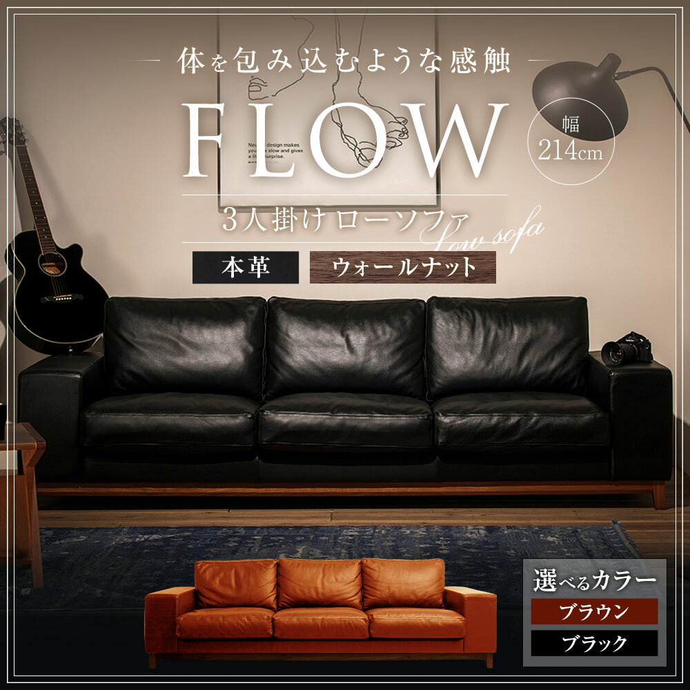 【ふるさと納税】フロー 3人掛けソファ 本革 選べるカラー( ブラック / ブラウン ) 1台 | FLOW レザーソファ ソファ ローソファ 高級シート 高密度ウレタン 木製 フレーム ウォルナット 黒 茶色 家具 インテリア カジュアル 川端装飾 長崎県 長崎市 送料無料