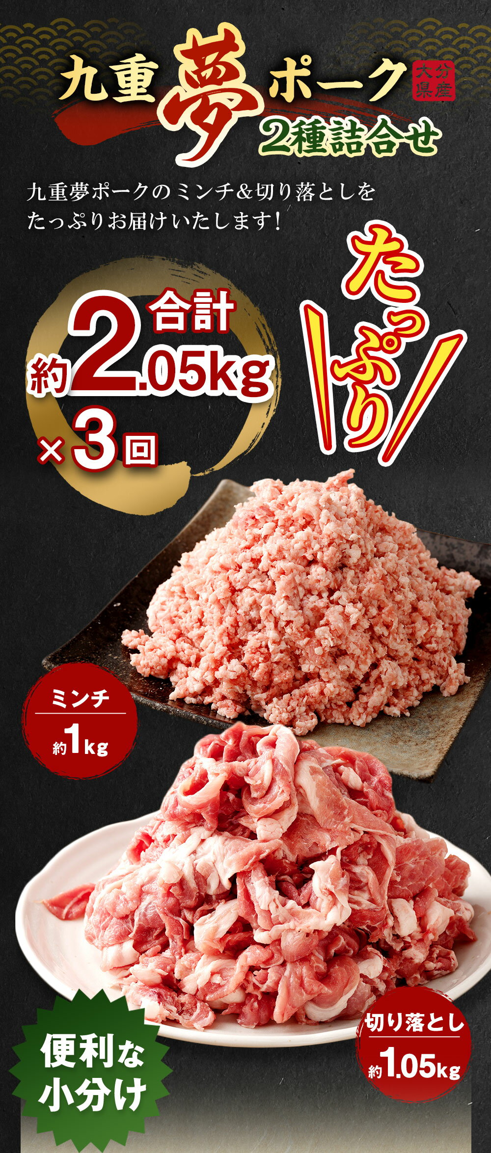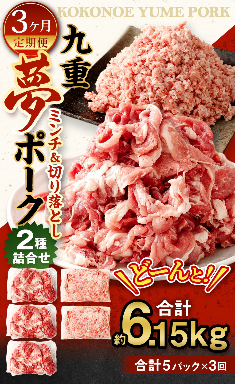 - 【ふるさと納税】【3ヶ月定期便】九重夢 ポーク お米豚 ミンチ 切り落とし セット 食べ比べ 合計6.15kg 約1kg 500g×2パック×3回 / 切り落とし 約1.05kg 約350g×3パック×3回 SPF 小分け 真空パック 豚ミンチ 挽肉 挽き肉 国産 九州産 大分県産 九重町産 冷凍 送料無料