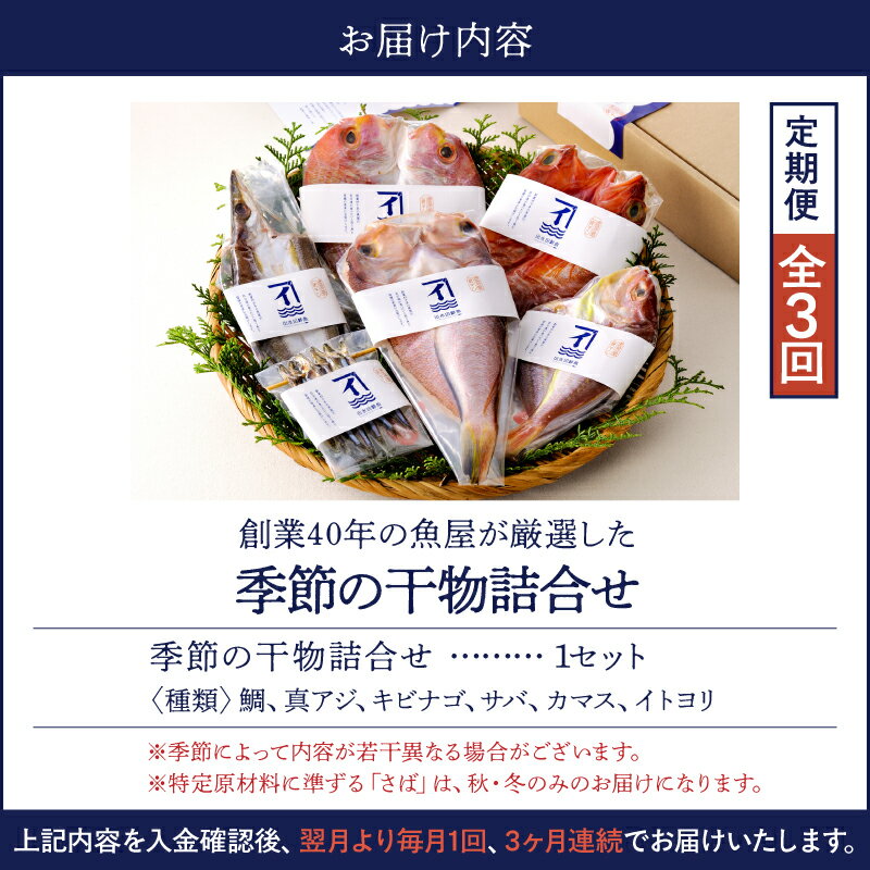 - 【ふるさと納税】【3ヶ月定期便】昭和49年創業の魚屋が厳選した季節の干物詰合せ 鯛 真アジ キビナゴ サバ カマス イトヨリ などの6種×1枚×3回 九州 熟成 乾燥 真空包装 海の幸 お楽しみ 焼き魚 セット サカナカケル 鹿児島 鹿屋市 おすすめ ランキング プレゼント ギフト
