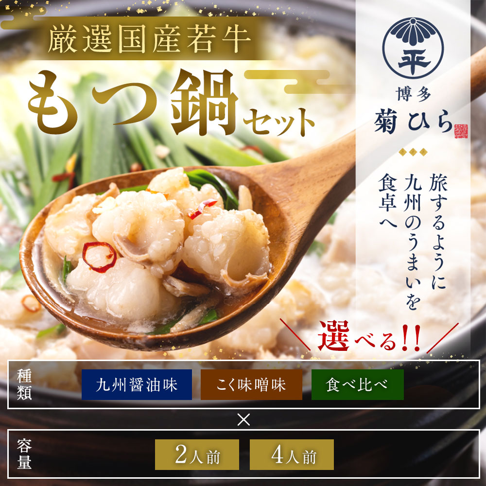 - 【ふるさと納税】<選べる 種類 容量>博多菊ひら 厳選 国産若牛もつ鍋 九州醤油味 こく味噌味 食べ比べ 2人前~合計4人前 国産 ちゃんぽん麺 もつ鍋 ホルモン鍋 ちゃんぽん麺 鍋セット もつなべ 福岡 グルメ お取り寄せ 冷凍 送料無料