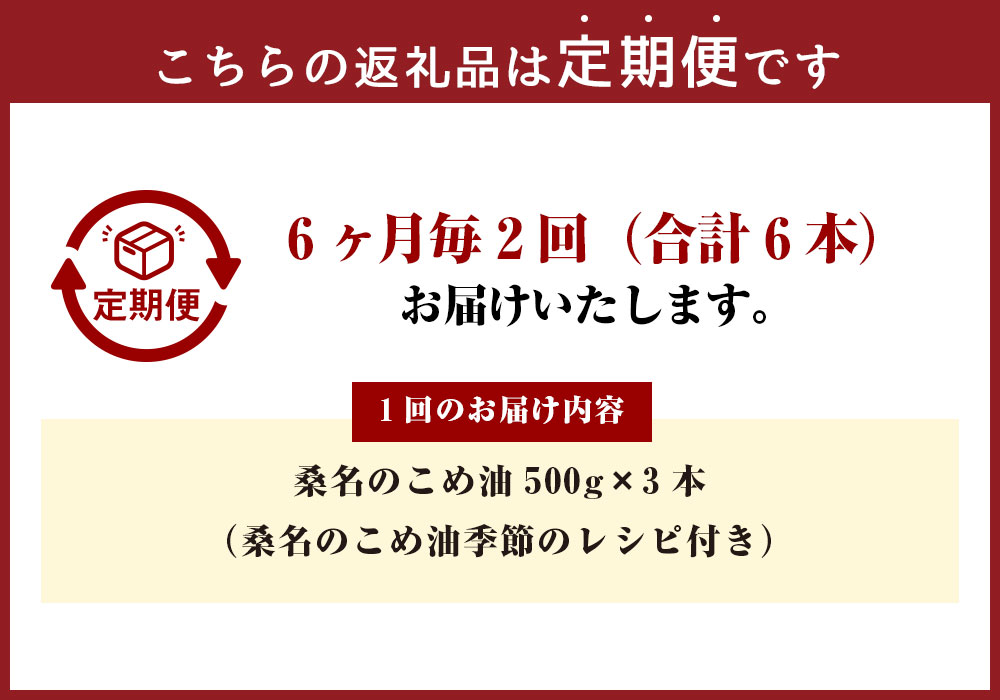 - 【ふるさと納税】【6ヶ月毎定期便2回】油清 桑名のこめ油 1回あたり計1.5kg(500g×3本入り) 桑名のこめ油季節のレシピ付き 米油 油 あぶら 米ぬか ビタミンE 食用油 調味料 揚げ物 炒め物 保健機能食品 健康 国産 三重県 桑名市 送料無料