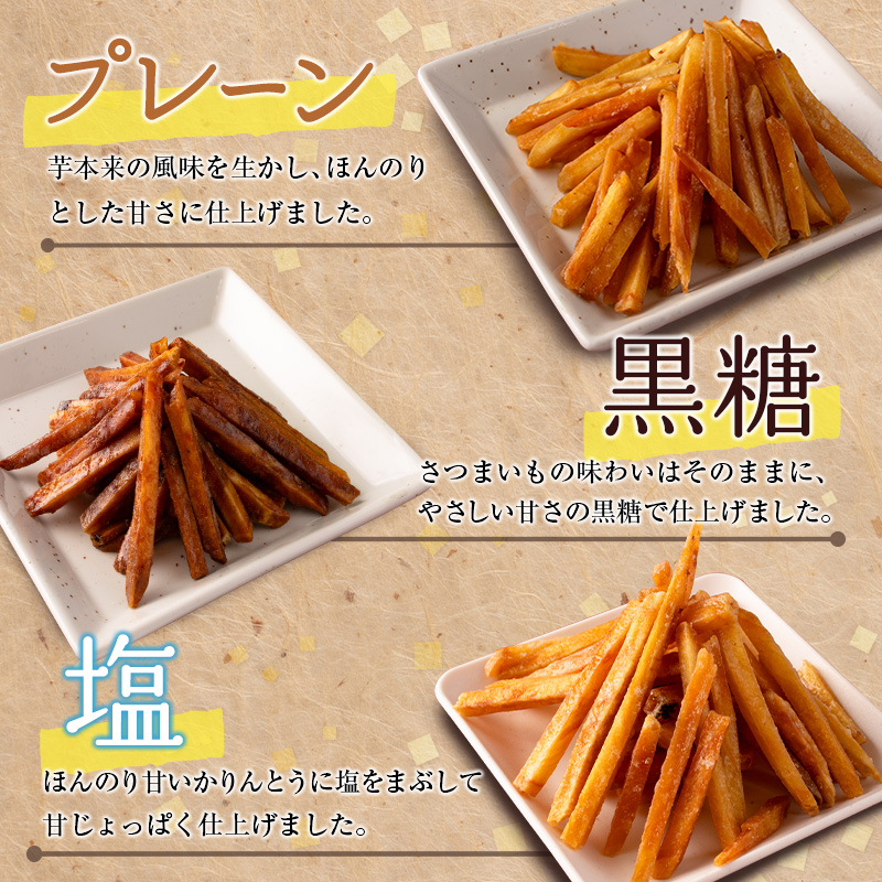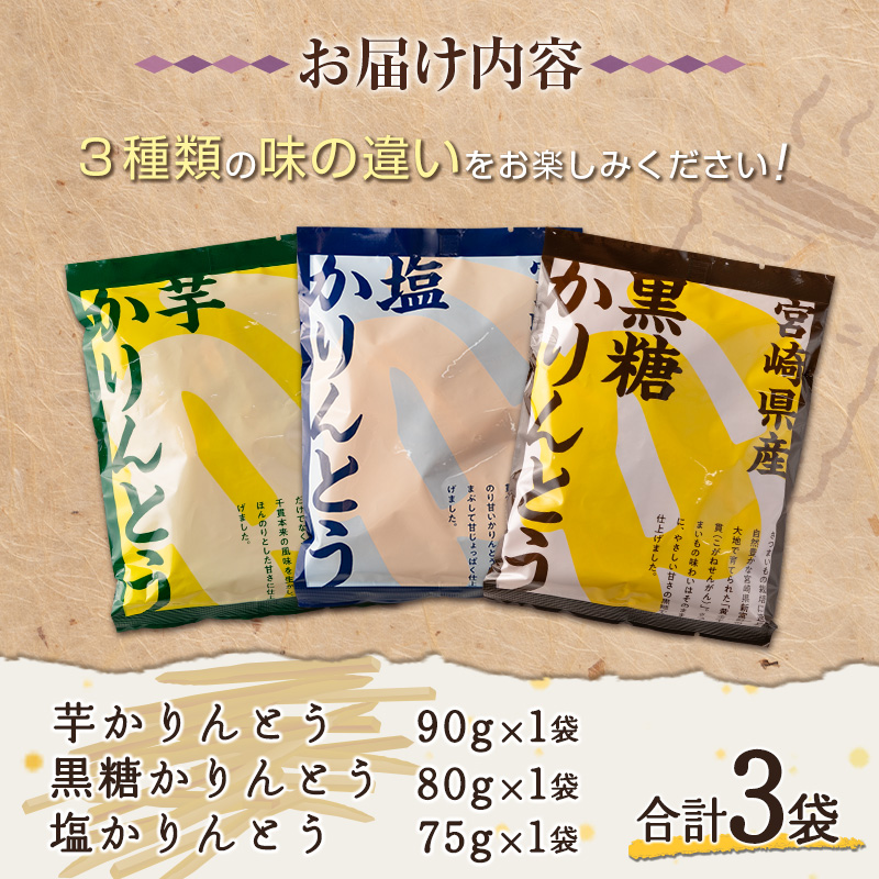 - [お試し]芋かりんとう3種(プレーン・黒糖・塩)合計3袋 宮崎県産サツマイモ 黄金千貫使用【P1】