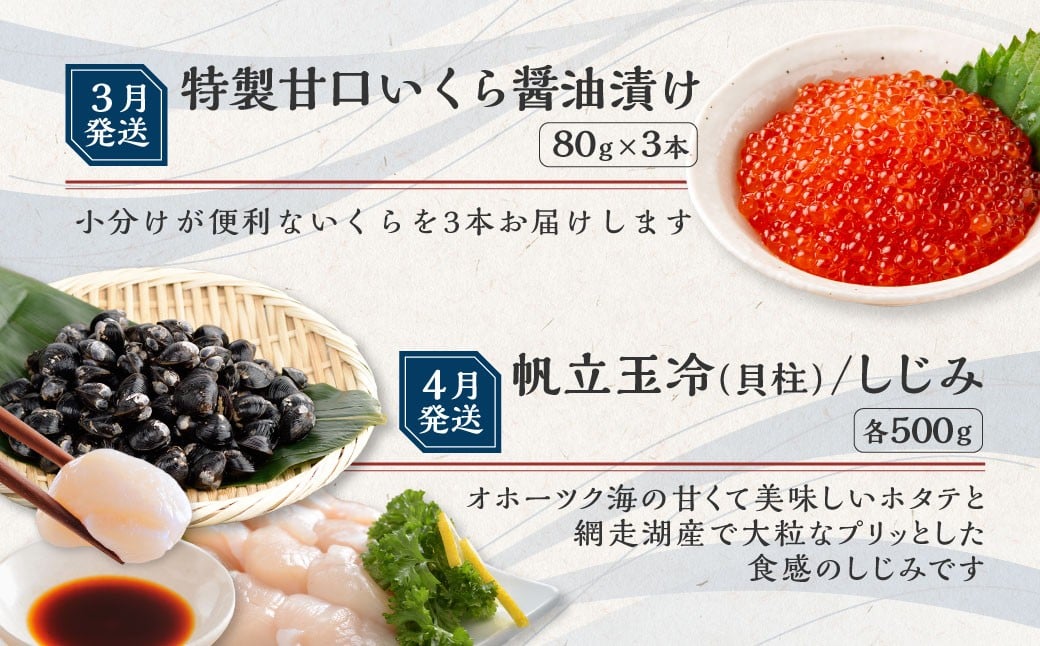 - 【定期便】オホーツクプレミア海鮮グルメ 全12回【 ふるさと納税 人気 おすすめ ランキング たらこ ホタテ しじみ うに いくら いか ほっけ 釣きんき ズワイガニ タラバガニ 鮭 海鮮 定期便 12か月 12ヶ月 オホーツク タラコ 帆立 ほたて シジミ ウニ 雲丹 イクラ いくら醤油漬 ホッケ キンキ サケ 蟹 カニ イカ 北海道 網走市 送料無料 】 ABAO2205