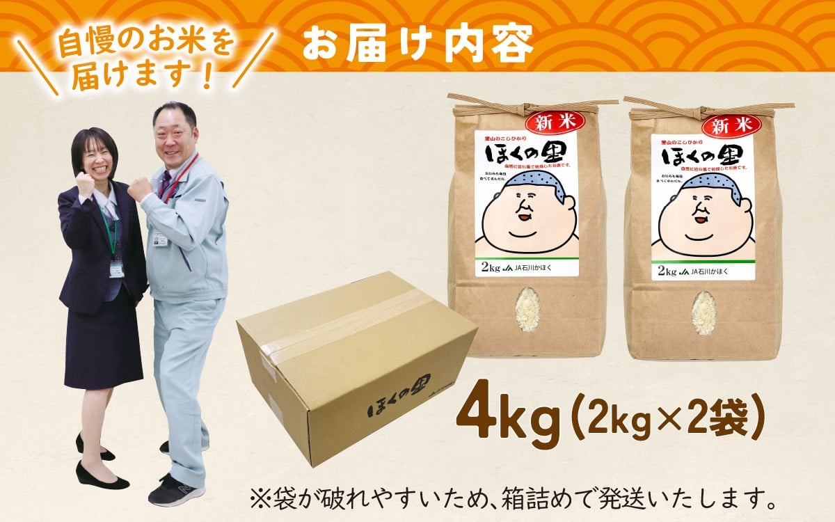 【災害・復興支援】【配送月が選べる】里山のこしひかり ほくの里 2kg × 2袋 計4kg 【2025年11月~2026年2月配送】 | 令和7年産 こしひかり コシヒカリ ブランド米 銘柄米 災害支援 お米 コメ こめ 4キロ 白米 精米 国産 選べる 石川県産