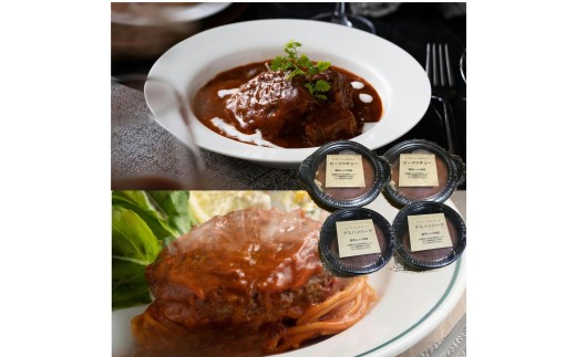 - プレミアム ビーフシチュー 350g×2個 と 煮込み デミグラス ハンバーグ 250g×2個 計4個セット