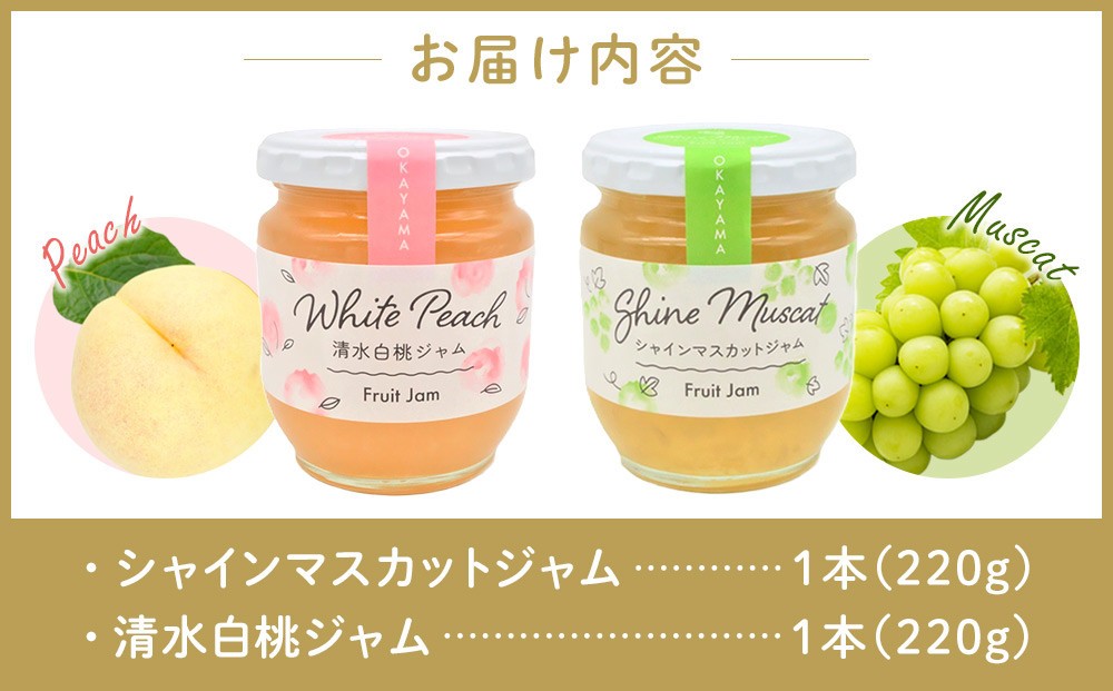 岡山県産 フルーツジャム 2本 セット(220g×2) 【 ジャム シャインマスカット 清水白桃 葡萄 ぶどう 桃 白桃 もも フルーツ おすすめ 岡山県 】