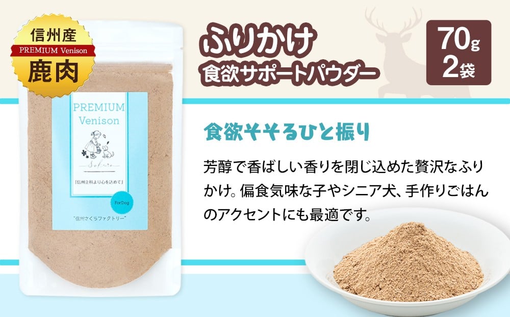 犬用おやつの詰め合わせ(信州産鹿肉 ふりかけ 食欲サポートパウダー 70g×2、信州産鹿肉 ジャーキー 薄切り 40g×1)