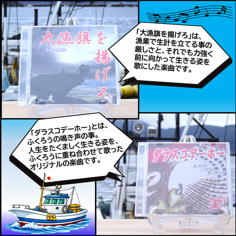 - ケッツラゲーおじさんのCD「ダラスコデーホー」×「大漁旗を揚げろ」2枚セット 振興丸 ふくろう 梟 方言 唄う漁師 フライキ ご当地ソング ご当地曲 ご当地シンガー 三陸山田 山田町 YD-1036