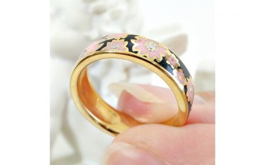6.5号 指輪 K18YG 桜リング (小) 【幅5.0mm】黒/ピンク ダイヤ 0.06ct 18金 イエローゴールド エポキシ 樹脂 レジン 無垢 男女兼用 アクセサリー【se001-k18yg-bp】 [20743774-d]