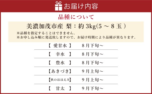 《先行予約》 山之上の梨 ( 品種はおまかせ ) 約3kg( 5~8玉 ) 愛甘水・幸水・豊水・あきづき・秋のほほえみ・甘太 なし フルーツ 冷蔵 岐阜県産 国産 岐阜県 美濃加茂市 送料無料 【2026年8月下旬~10月上旬発送予定】