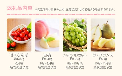 - 【先行予約】楓 フルーツ 定期便 全4回 さくらんぼ 佐藤錦 もも 白桃 ぶどう シャインマスカット ラ・フランス ギフト 果物 2026年産 山形県産 mm-ft4xx