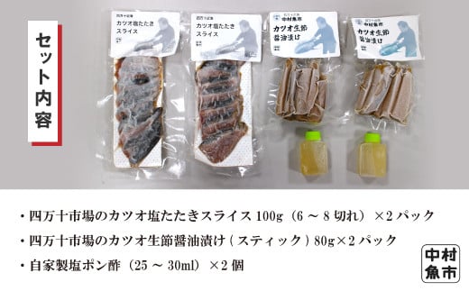 - 26-16.四万十市場のカツオ塩たたき自家製塩ポン酢(塩振り、スライス済み、血合い抜き)・カツオ生節醤油漬けセット