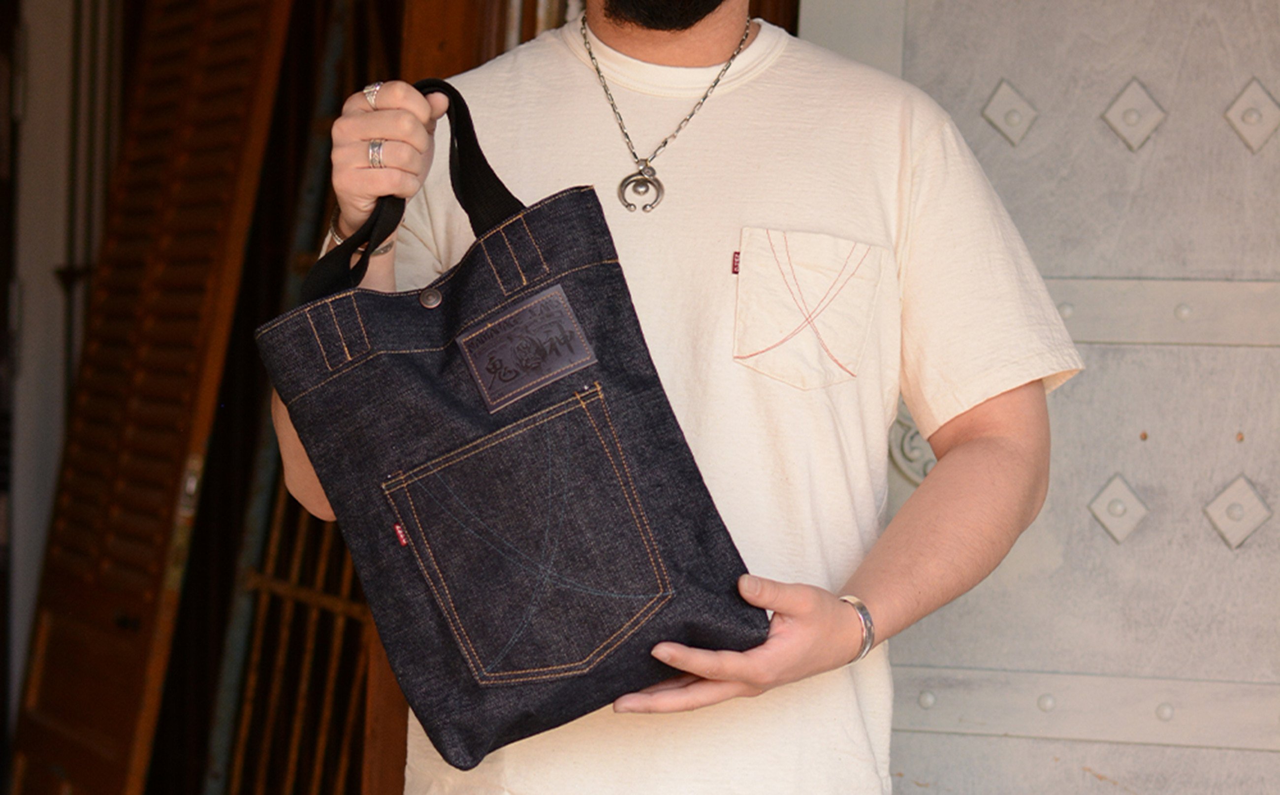 拘りの本物ご当地ジーンズなまはげジーンズデニムトート(青鬼モデル) 80P7307 / デニム素材 デニム生地 bag 手提げ てさげ 東北 秋田 ギフト プレゼント 贈り物 母の日 父の日 敬老の日 誕生日 記念日 お祝い 祝 東北 秋田 大館 袋 バッグ ジーンズ生地 なまはげジーンズ