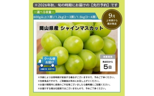 - 【2026年発送分 先行予約】岡山県産 シャインマスカット (600g/1.2kg/1.5kg)【ご家庭用】【025-a034】【025-a035】【025-a036】