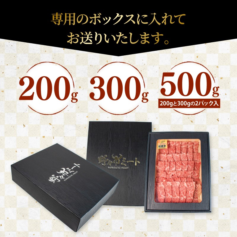 - 黒毛和牛 うで 焼肉用 能登牛 500g 300g 200g ギフト 選べる容量 小分け とろける 食感 希少 ギフトボックス 贈答 プレゼント ブランド 和牛 国産 肉 冷凍 石川 羽咋 能登 国産 能登半島 牛 牛肉 焼肉 焼き肉 炒め物 にも 災害支援 復興支援