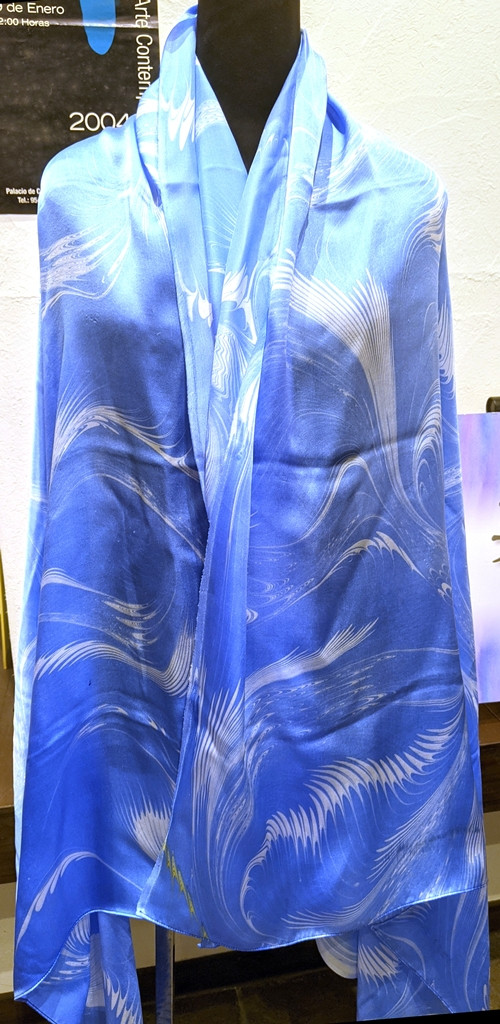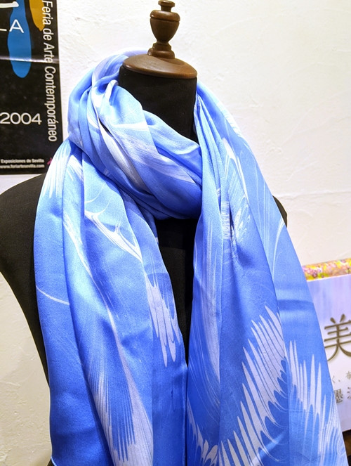 墨流し染 シルク ロング ストール 青羽柄 大判 / 染美堂 絹 サテン織 奈良県 葛城市【snbd003】