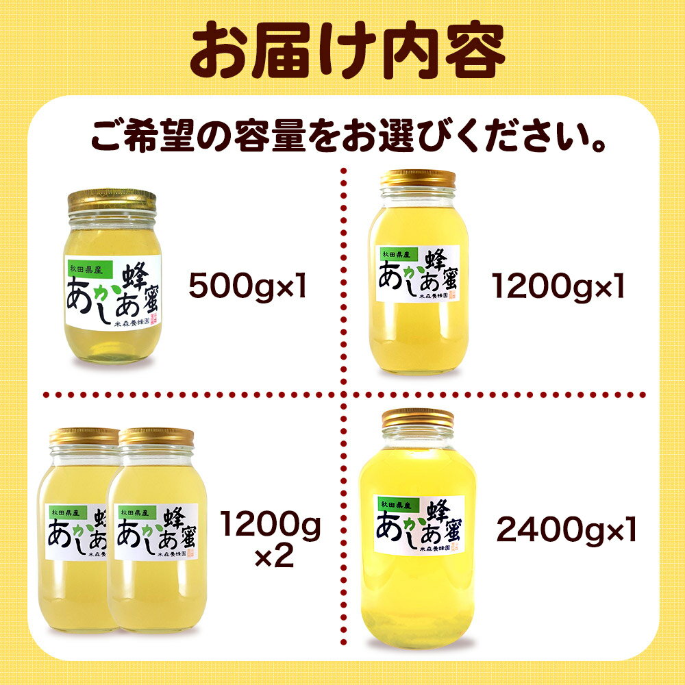【ふるさと納税】はちみつ あかしあ 国産 選べる容量500g×1本・1200g×1本・1200g×2本・2400g×1本 秋田県産100% 秋田白神の天然蜂蜜 米森養蜂園