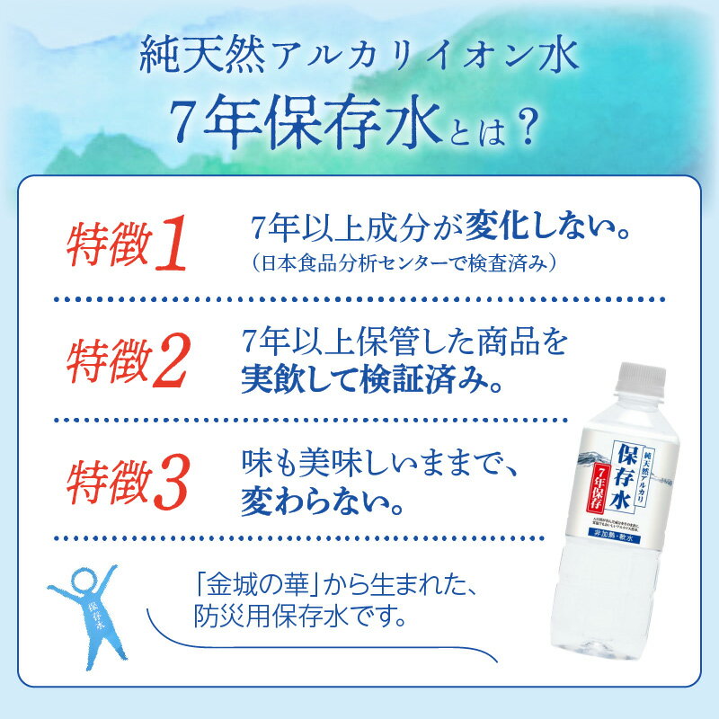 - 【ふるさと納税】【定期便】ミネラルウォーター(500ml)金城の華 定期コース 12回(初回のみ7年保存水同梱)定期便 天然水 飲料水 アルカリイオン 水 国産 長期保存水 長期保存 防災 備蓄 非常用 保存用 送料無料 7年保存 保存用 防災用 【043_1833】