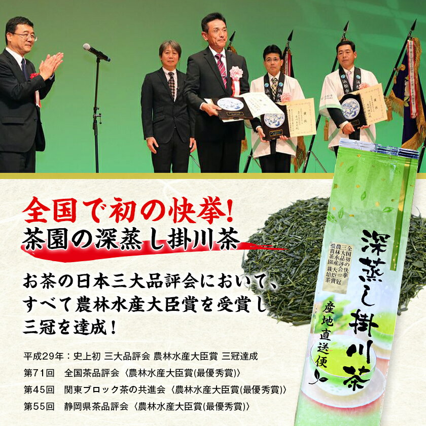 - 【ふるさと納税】全国初の快挙!日本三大品評会 農林水産大臣賞受賞 三冠茶園 深蒸し掛川茶 200g×6袋_ お茶 緑茶 茶葉 煎茶 掛川茶 深蒸し 深蒸し茶 おちゃ 茶 日本茶 200g×6袋 静岡県産 静岡県 掛川市 飲料 ギフト 送料無料 【配送不可地域:離島・沖縄県】【1302629】