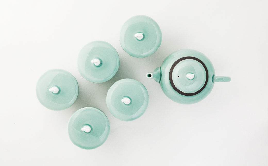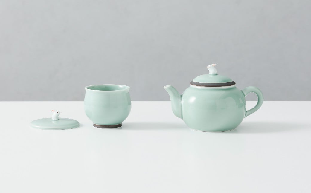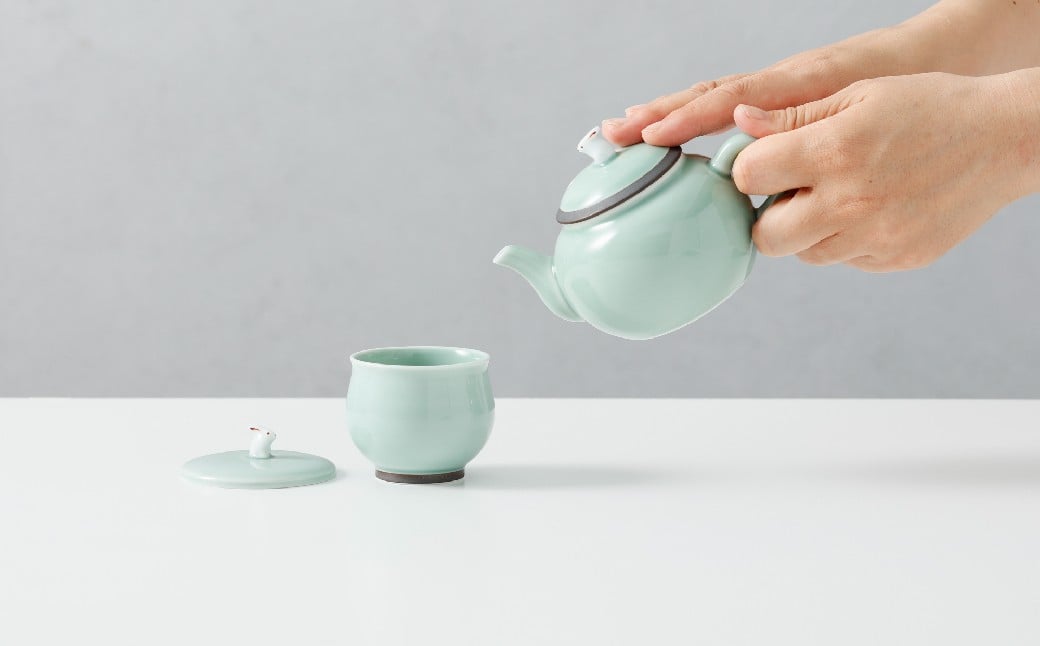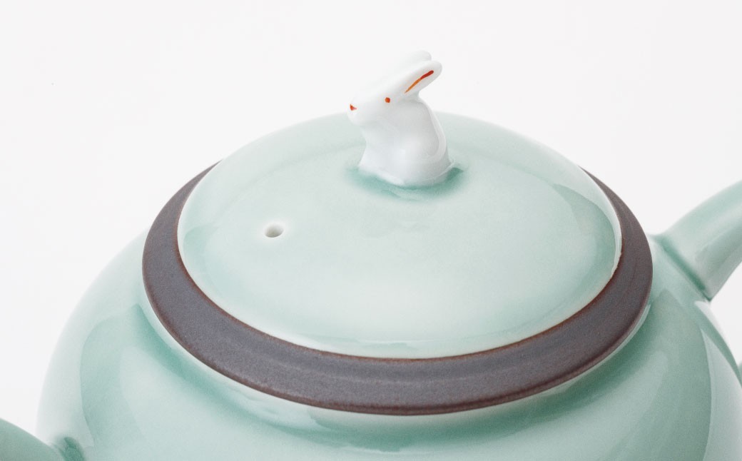 - 【セット】【深川製磁】有田焼/笹青磁うさぎ急須茶器揃