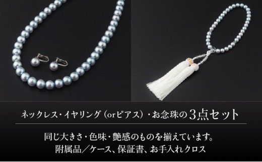 【艶々マーメイドブルーのアコヤ真珠】シルバーブルーグレー系アコヤ真珠ネックレス・イヤリング(ピアス)・お念珠の3点セット V-119