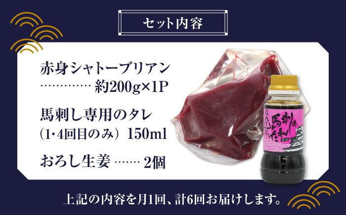 【6回定期便】【純国産】馬肉 赤身 シャトーブリアン 約 200g タレ付 国産 馬刺し ヒレ 馬肉 ヘルシー 専用タレ付き 小分け おろし生姜 低カロリー 高タンパク 冷蔵 真空パック ギフト 贈答用 おつまみ 熊本 山鹿市【有限会社 九州食肉産業】[ZDQ030]