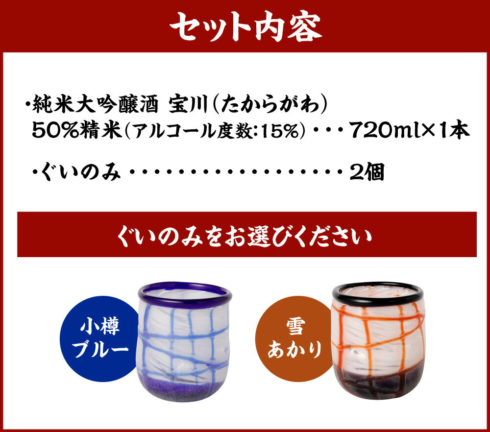 - 【ふるさと納税】小樽の地酒を小樽のグラスで。 【純米大吟醸宝川】 と 【ぐいのみ】 2個セット 選べるカラー (小樽ブルー / 雪あかり) 宝川 純米大吟醸酒 日本酒 地酒 お酒 酒 さけ ぐい呑み 飲み物 飲料 ガラス 北海道 小樽市 常温 送料無料