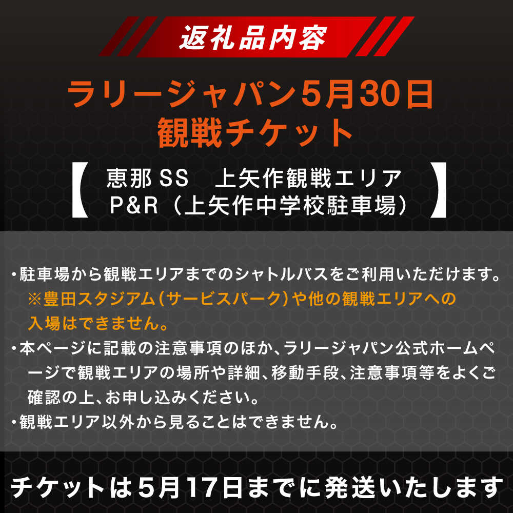 - 【ふるさと納税】【選べるチケット】ラリージャパン【恵那SS(上矢作観戦エリア)観戦券 P&R(上矢作中学校駐車場)】5月30日(土)[AUAQ045]