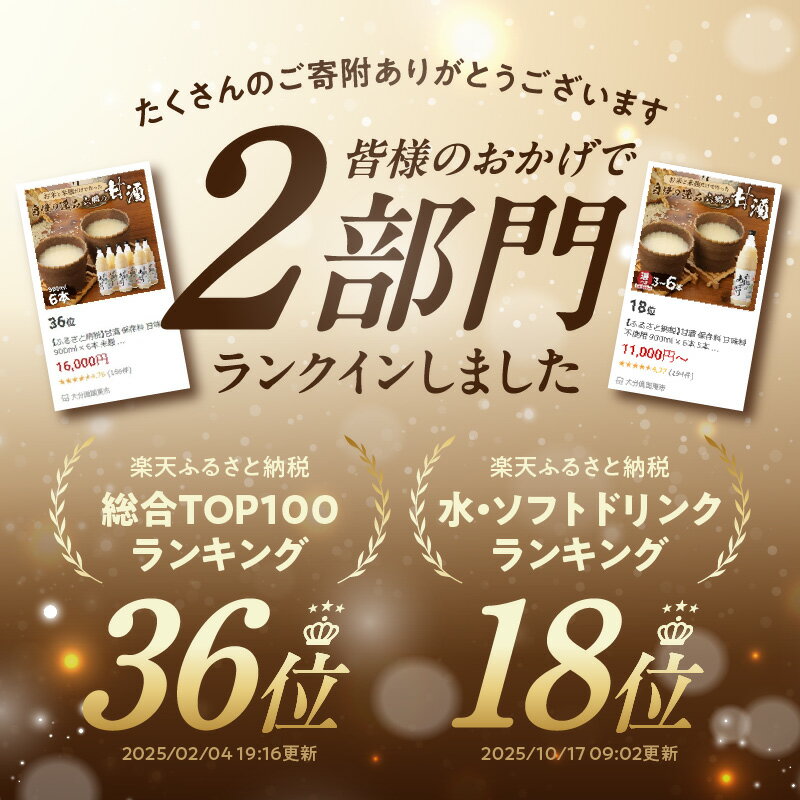 【ふるさと納税】六郷の甘酒 お米と米麹だけ 選べる容量 900ml×3~6本 国産 大分県産 保存料/甘味料不使用 飲む点滴 健康美肌 ビタミンB群 必須アミノ酸 麹のちから ホット アイス 発酵食品 砂糖代用 麹甘酒 ノンアルコール お取り寄せ 大分県 国東市 送料無料
