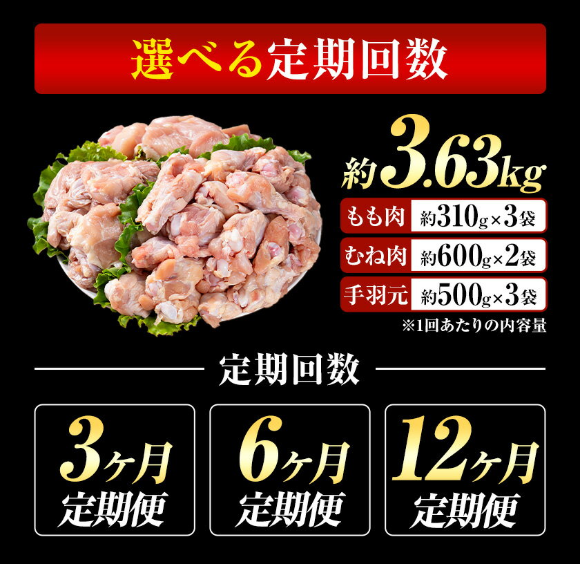 - 【ふるさと納税】選べる 定期便 九州産 若鶏もも肉(310g×3袋) ムネ肉(600g×2袋) 手羽元 セット(500g×3袋) 計3.63kg 鶏肉 肉 鶏 手羽 手羽元 唐揚げ 詰め合わせ セット 冷凍 九州 国産 熊本県 菊池市 送料無料《お申し込みの翌月から出荷》