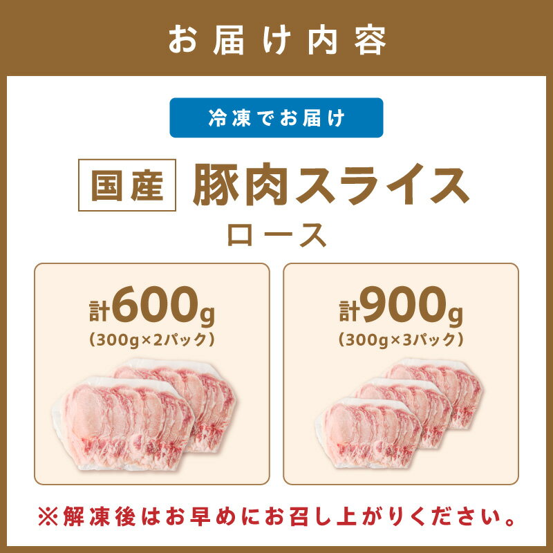 - 【ふるさと納税】\選べる内容量!/国産豚肉ローススライス1.5mm 計600g 900g 肉 国産 豚 スライス 豚ロース 小分け 冷凍 生姜焼き 肉巻き 炒め物 しゃぶしゃぶ 豚丼 豚汁 使い勝手 便利 おすすめ お弁当 おかず 晩ご飯 お鍋 おすそ分け ふるさと納税 豚肉 小分け